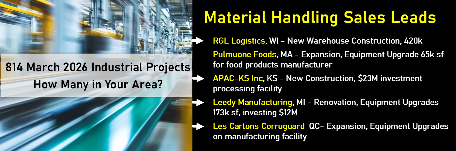 Each month, Industrial SalesLeads deliver hundreds of verified, purchase-ready sales leads across the U.S. and Canada, complete with company and contact information. These verified projects show you the active buyers for lift trucks, conveyors, storage, packaging, loading dock, and manufacturing equipment, giving dealers and distributors immediate access to new opportunities that keep pipelines full and drive revenue growth.